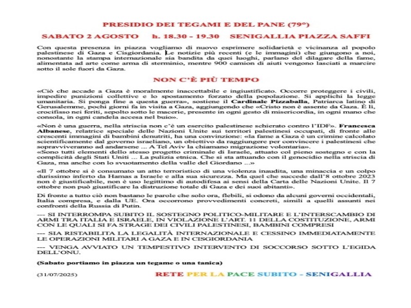 Con questa presenza in piazza vogliamo di nuovo esprimere solidarietà e vicinanza al popolo palestinese di Gaza e Cisgiordania. Le notizie più recenti (e le immagini) che giungono a noi, nonostante la stampa internazionale sia bandita da quei luoghi, parlano del dilagare della fame, alimentata ad arte come arma di sterminio, mentre 900 camion di aiuti vengono lasciati a marcire sotto il sole fuori da Gaza.