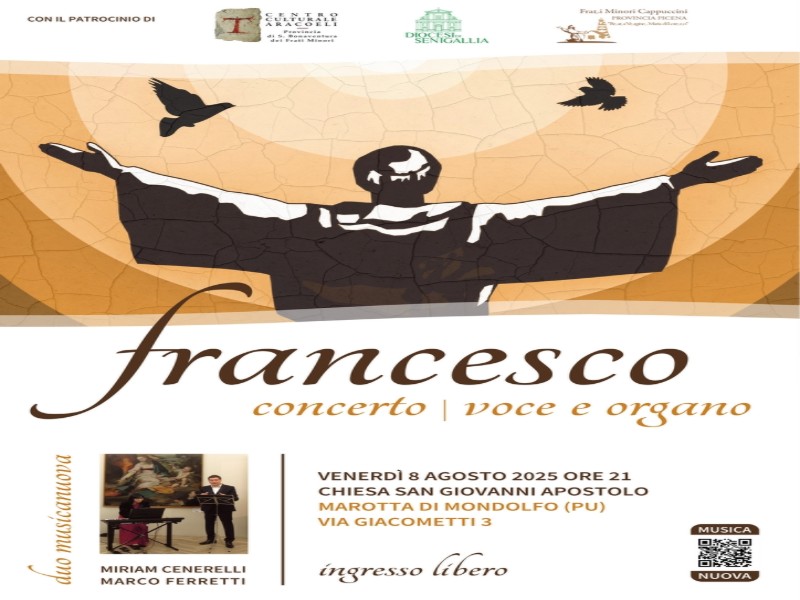 Debutta venerdì 8 agosto il nuovo concerto ispirato a San Francesco d’Assisi che l’associazione Musica Nuova di Senigallia ha realizzato in occasione del Centenario Francescano 2023-2026 per gli 800 anni della Regola Bollata, del Natale di Greccio, delle Stimmate, del Cantico delle creature e della Pasqua di Francesco.
