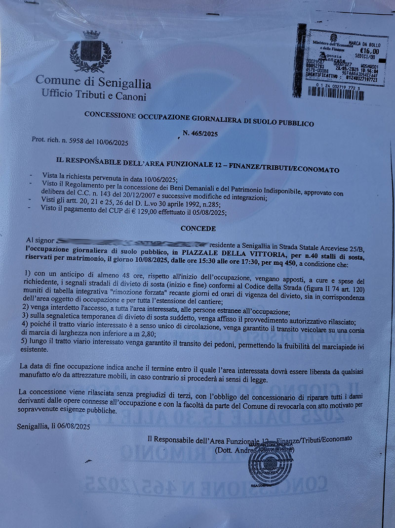 Concessione parcheggi pubblici riservati a privati per un matrimonio
