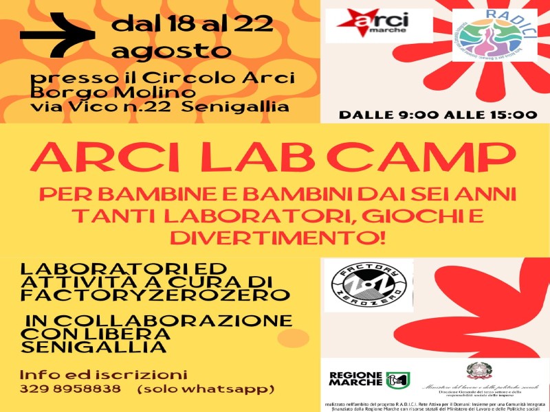 Arci Lab Camp si svolgerà presso il Circolo Arci Borgo Molino, via Vico n.22 (Senigallia), da lunedì 18 agosto a venerdì 22 agosto 2025 dalle 9:00 alle 15:00 con merenda e pranzo al sacco. Accoglieremo bambine e bambini dai sei anni in poi fino ad un max di 18 partecipanti. Questa attività rientra nel progetto Radici, Rete Attiva per il Domani: insieme per una comunità integrata, finanziato dalla regione Marche con risorse Statali del Ministero del Lavoro e delle Politiche Sociali. La partecipazione è gratuita.
