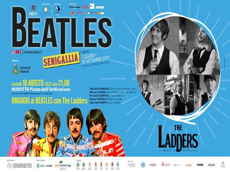 Marotta di Mondolfo – Piazza dell’Unificazione – Comune di Mondolfo e BeatleSenigallia presentano OMAGGIO ai BEATLES con The Ladders (Fabrizio Romagnoli voce, basso, chitarra acustica; Massimo Gerini voce, chitarra acustica ed elettrica; Riccardo Scarponi chitarra elettrica; Mauro Cimarra batteria e sampler e Gabriele Chiappa voce e tastiere).