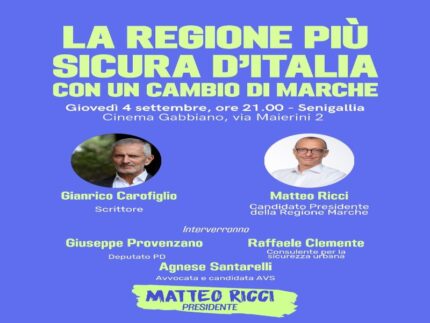 “La Regione più sicura d’Italia con un Cambio di Marche”, questo il titolo della nuova iniziativa tematica di Matteo Ricci, europarlamentare PD e candidato alla presidenza della Regione Marche, che si terrà giovedì 4 settembre alle ore 21:00 presso il Cinema Gabbiano di Senigallia (AN), in via Maierini 2.