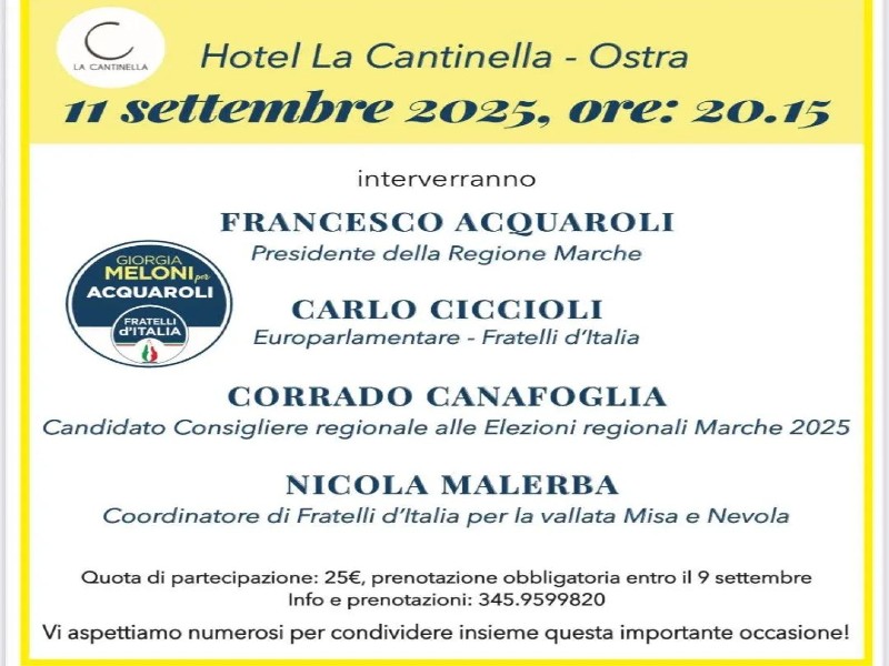 Giovedì 11 settembre nella cornice del ristorante La Cantinella ad Ostra, il Governatore delle Marche Francesco Acquaroli, accompagnato dall europarlamentare Carlo Ciccioli e tutta la dirigenza politica di Senigallia e della vallata del Misa e Nevola lanceranno la candidatura dell avvocato Corrado Canafoglia per le regionali.