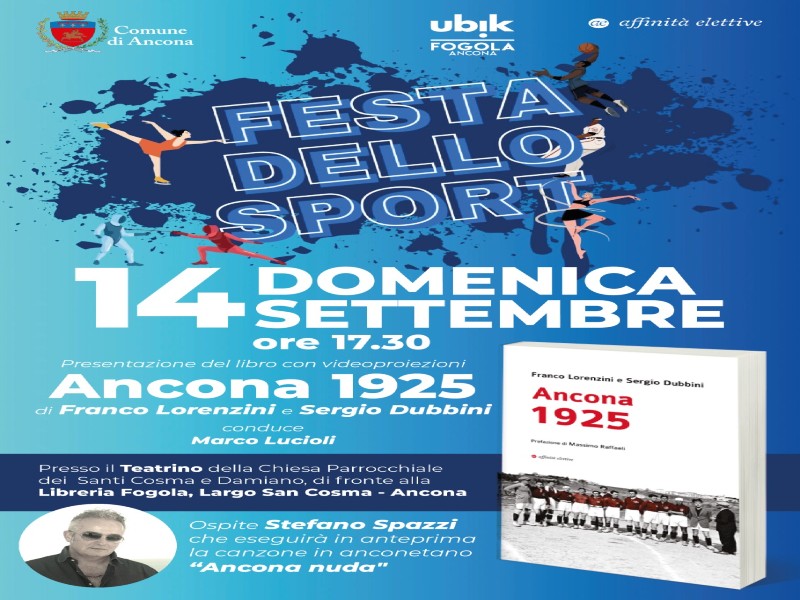 In occasione della Festa dello Sport organizzata dal Comune di Ancona, si terrà, presso il teatrino della chiesa di San Cosma, situato in corso Mazzini, davanti alla libreria Fogola, la ripresentazione del libro “Ancona 1925” che sarà accompagnata dalla straordinaria partecipazione del cantautore anconetano Stefano Spazzi.