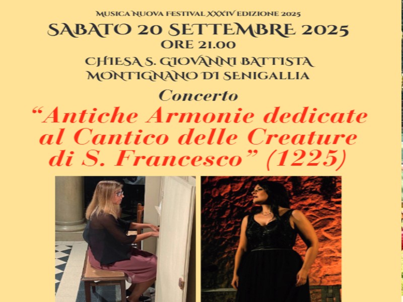 Si conclude il Musica Nuova Festival XXXIV edizione 2025 con ‘ultimo evento che si terrà sabato 20 settembre alle ore 21.00 presso la Chiesa S. Giovanni Battista di Montignano con il concerto “Antiche Armonie dedicate al Cantico delle Creature di S. Francesco (1225)”; si ascolteranno lavori musicali di Gherardeschi, Morandi, Fauré, Bach, Gounot, Vivaldi, Schubert per celebrare l’Anniversario del “Cantico delle Creature” (1225) di S. Francesco d’Assisi.