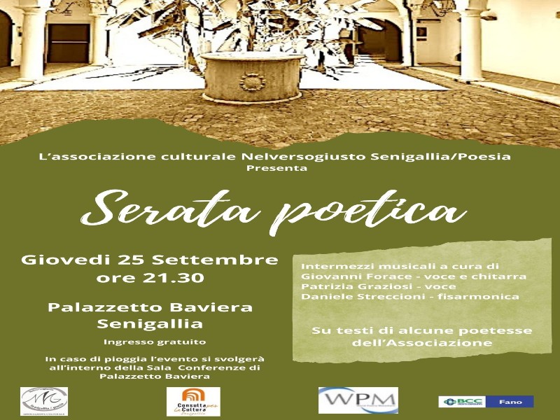 L’associazione culturale Nelversogiusto Senigallia/Poesia, è lieta di invitare la cittadinanza a partecipare a una speciale Serata poetica, che si terrà giovedì 25 settembre alle ore 21.30 nel suggestivo scenario del cortile del Palazzetto Baviera, luogo simbolo della storia e della cultura cittadina.
