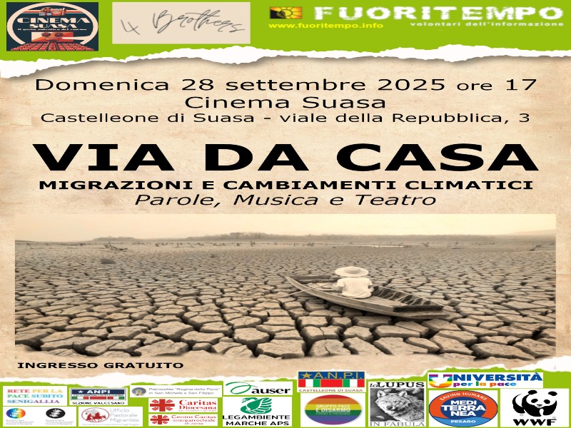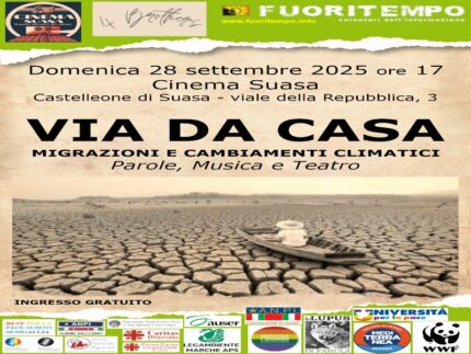 Domenica 28 settembre alle ore 17,00 a Castelleone di Suasa, presso il Cinema Suasa, verrà realizzato lo spettacolo “Via da casa”. Un racconto su migrazioni e cambiamenti climatici con Parole, Musica e Teatro.