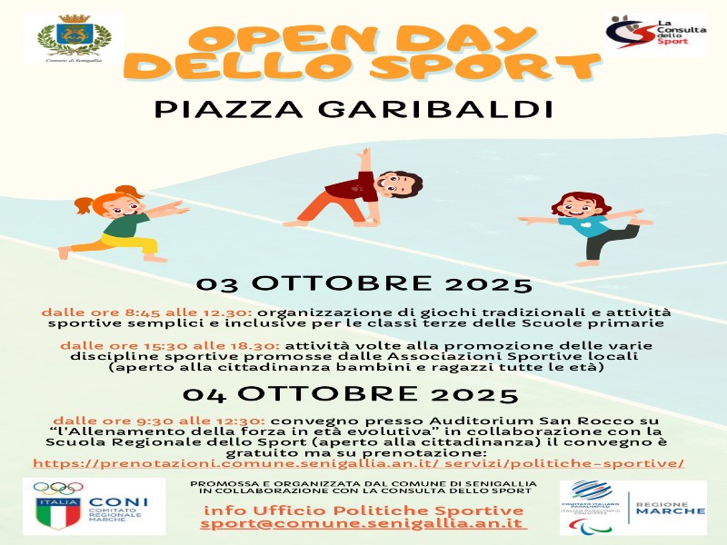 Il Comune di Senigallia in collaborazione con la Consulta dello Sport organizza la 2^ edizione dell’iniziativa OPENDAY DELLO SPORT, che si terrà Venerdì 3 OTTOBRE 2025 in Piazza Garibaldi.
