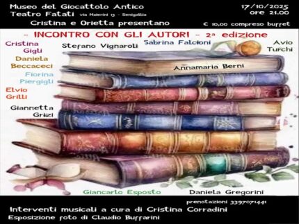 Venerdì 17 ottobre 2025 alle ore 21 il Teatro Fatati del Museo del Giocattolo Antico di Senigallia in via Maierini 13 – via Pisacane 43/45 ospiterà il secondo appuntamento di “INCONTRO CON GLI AUTORI”, una serata che unisce arte, parola e melodia in un intreccio di emozioni e creatività.