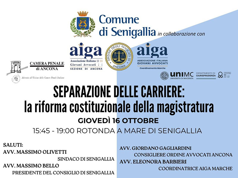 Si terrà giovedì prossimo, 16 ottobre alle ore 15,45, nell’affascinante cornice della Rotonda a Mare di Senigallia, una Conferenza pubblica, aperta alla cittadinanza, sulla “Separazione delle carriere: la riforma costituzionale della magistratura”, organizzato dal Comune di Senigallia in collaborazione con AIGA (Associazione Italiana Giovani Avvocati) sezione di Ancona, nonché con il patrocinio dell’Ordine degli Avvocati di Ancona e dell’Università degli Studi di Macerata, Dipartimento di Giurisprudenza, ed in sinergia con la Camera Penale di Ancona ed il Coordinamento AIGA Marche.