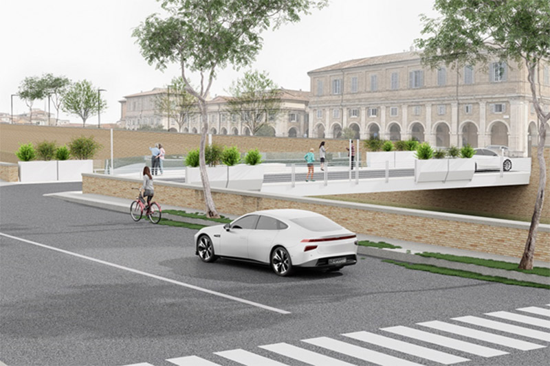 4. E’ prevista una seduta panoramica che guarda a valle, e cioè ai Portici Ercolani fino al Foro Annonario. Questa balconata panoramica sarà sicuramente un importante punto di forza dal punto di vista del godimento del nostro patrimonio storico artistico e un nuovo polo di attrazione turistica.
