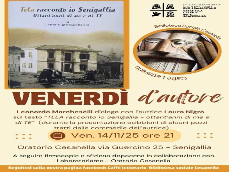 Presso il salone dell’Oratorio di Cesanella, sul sagrato della Chiesa, a lato della sede della Biblioteca sociale, nell’ambito del “Venerdì d’Autore” il 14.11.25 alle ore 21,00, l’Autrice Laura Nigro presenta il libro “Tela racconto io Senigallia, Ottant’anni di me e di te” per la Ventura edizioni, nel quale sono raccolte alcune sue commedie dialettali.