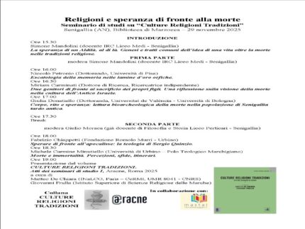 Si svolgerà sabato 29 novembre 2025 dalle 15.30 alle 19.30 a Senigallia, presso la biblioteca di Marzocca, il seminario di studi “Religioni e speranza di fronte alla morte” organizzato dal comitato della Collana “Culture Religioni Tradizioni” che, con l’uscita del primo volume a cura di Matteo De Chiara e Giovanni Frulla, Culture religioni tradizioni. Atti dei Seminari di studio I (Aracne, Roma 2025), ha avviato la serie delle sue pubblicazioni raccogliendo i testi dei Seminari di studio del 2016, del 2017 e del 2019.