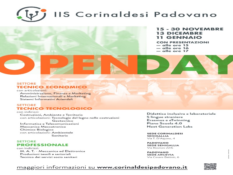Domenica 30 novembre il grande Polo tecnico-professionale Corinaldesi Padovano tornerà ad aprire le sue porte: famiglie e studenti di terza media potranno conoscerne l’ampia offerta formativa ed esplorarne i tre plessi, dislocati fra Senigallia e Arcevia.