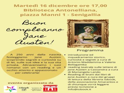 Il 2025 celebra il 250° anniversario della nascita di Jane Austen (16 dicembre 1775), con celebrazioni globali, eventi in Inghilterra (specialmente nell’Hampshire, dove visse e morì) e in Italia, tra cui festival, mostre, nuove edizioni dei libri e giornate di studio, sottolineando come i suoi temi rimangano attuali e la rendano un’icona culturale senza tempo. Anche noi a Senigallia vogliamo ricordare la figura di Jane Austen con un evento aperto a tutti alla Biblioteca Comunale Antonelliana di Senigallia, martedì 16 dicembre, ore 17.00.