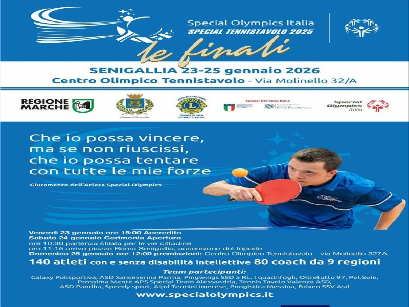 Sabato 24 gennaio 2026 si terrà la cerimonia di apertura della manifestazione sportiva di tennistavolo “Special Olympics Italia – le finali”, organizzata da Special Olympics e l’A.s.d. Tennistavolo Senigallia, in collaborazione con il Comune di Senigallia.
