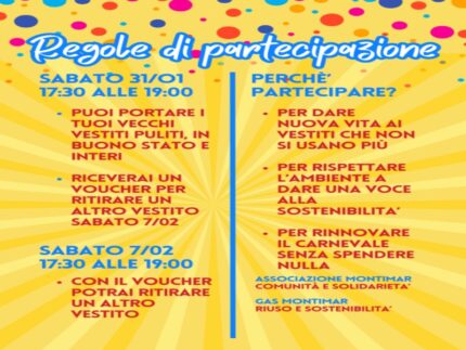 • Sabato 31 gennaio, dalle 17:30 alle 19:00: si portano i costumi di Carnevale puliti e in buono stato e si riceve un voucher.