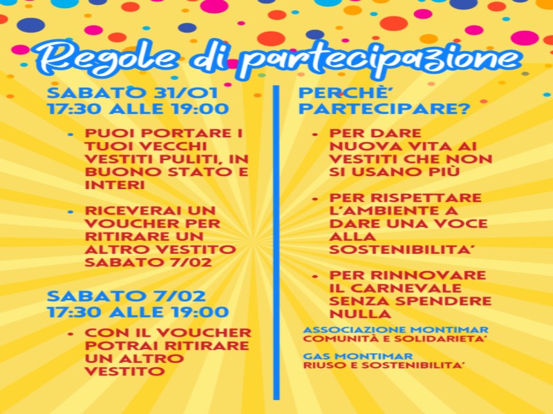 Con il Carnevale arriva la voglia di travestirsi, giocare, immaginare… ma anche di farlo in modo più leggero per il pianeta e più ricco per le relazioni. Per questo nasce lo Swap Party di Carnevale, un’iniziativa dell’Associazione Montimar e del GAS Montimar, aperta a tutta la comunità di Marzocca e dedicata a bambini, ragazzi e adulti.