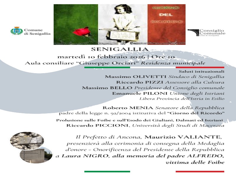 Martedì 10 febbraio 2026, alle ore 10, presso l’Aula consiliare “G. Orciari” della Residenza municipale, si terrà la cerimonia di consegna della Medaglia d’Onore – Onorificenza del Presidente della Repubblica alla Signora Laura Nigro, alla memoria del padre Alfredo Nigro, vittima delle Foibe. Alla cerimonia presenzierà S.E. il Prefetto di Ancona, Maurizio Valiante.