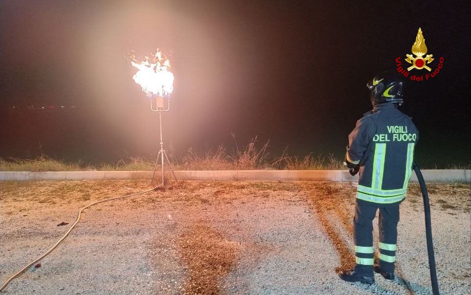 L’intervento ha visto l’impiego del nucleo NBCR (Nucleare, Biologico, Chimico, Radiologico), che ha effettuato le operazioni di messa in sicurezza della bombola mediante la combustione controllata del gas in torcia, consentendo la successiva bonifica dell’area e l’eliminazione di ogni potenziale rischio.