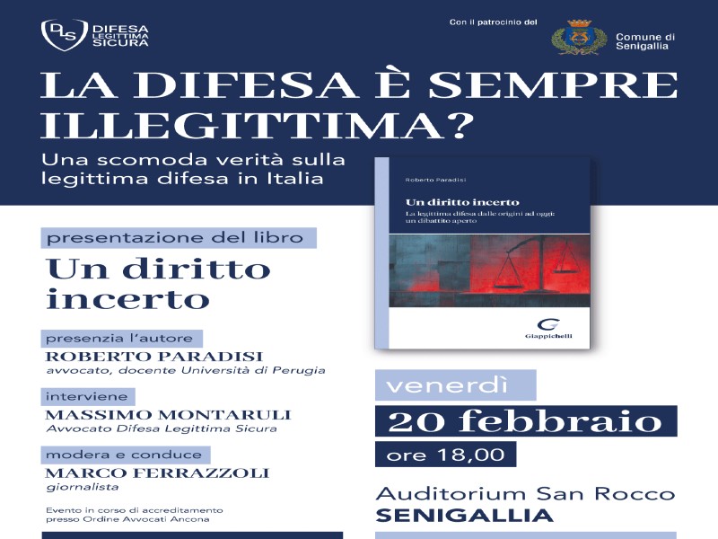 Sarà la domanda che, come uno “spettro”, aleggerà venerdì 20 febbraio all’auditorium San Rocco di Senigallia dove, a partire dalle ore 18, Difesa Legittima Sicura presenta il nuovo libro dell’Avvocato Roberto Paradisi sulla legittima difesa dal titolo evocativo. “Un diritto incerto. La legittima difesa dalle origini ad oggi: un dibattito aperto”. Il libro, edito da Giappichelli, affronta temi particolarmente caldi e sentiti dall’opinione pubblica che si è divisa, ad esempio, sul caso Roggero (condannato a 14 anni di carcere per aver sparato ai malviventi ad azione criminale terminata) o sui casi che, più recentemente, hanno riguardato militari dell’Arma dei carabinieri. A condurre un vero e proprio dialogo con l’autore sarà il giornalista romano Marco Ferrazzoli e interverrà sui temi dibattuti l’avvocato Massimo Montaruli, componente di Difesa Legittima Sicura. Il volume, già in vendita nei cataloghi on line di Giappichelli, riprende un meticoloso lavoro licenziato nel 2019 con alcune rivisitazioni e, soprattutto, con una nuova parte dedicata agli effetti della riforma “estensiva” della legittima difesa (noto lo slogan che accompagnò la riforma: “la difesa è sempre legittima”) alla luce delle pronunce recentissime della Corte di Cassazione.
