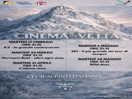 Il Cinema Gabbiano lancia una nuova rassegna dal titolo Cinema in vetta, che grazie alla collaborazione con la sezione senigalliese del C.A.I. (Club Alpino Italiano) proporrà in sala una serie di cinque proiezioni tutte dedicate agli appassionati della montagna.