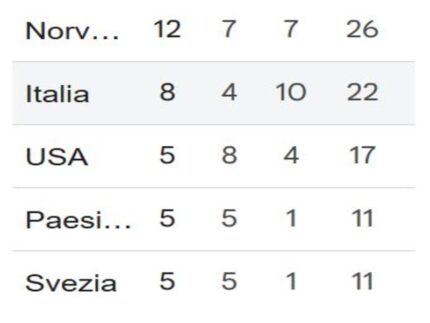 Miglior risultato della storia già centrato come numero di medaglie, 22, ed ori, 8, dal punto di vista del piazzamento sarebbe storico anche difendere il secondo posto dietro l’inarrivabile Norvegia che viaggia verso il quarto primato consecutivo nelle Olimpiadi invernali.