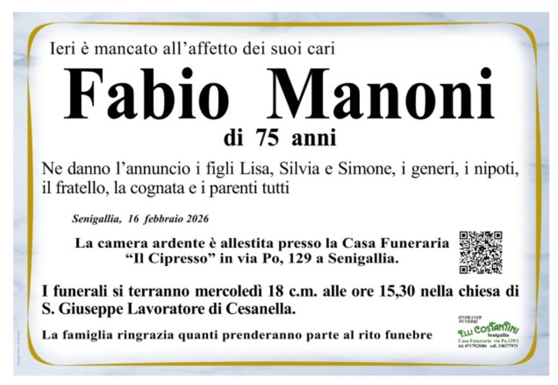 Ieri è mancato all’affetto dei suoi cari Fabio Manoni, di anni 75.