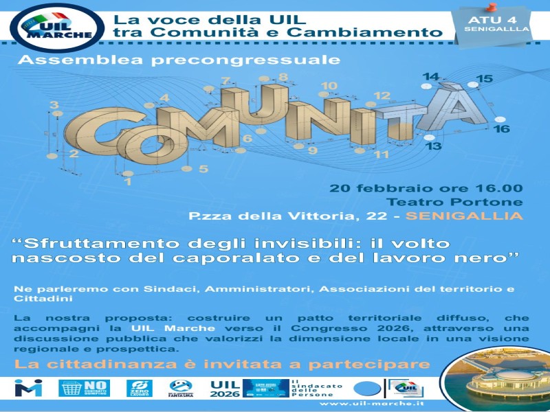 La proposta della UIL è quella di costruire un patto territoriale diffuso, attraverso una discussione locale in una visione regionale e prospettica. Dopo i saluti istituzionali seguiranno gli interventi del Segretario di zona Pasquale Bencivenga e di Maurizio Cionfrini della Segreteria Confederale. Interverranno rappresentanti delle istituzioni e delle associazioni, concluderà la Segretaria della UIL Marche Claudia Mazzucchelli.