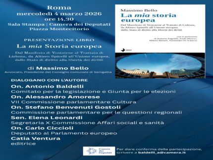Mercoledì 4 marzo, alle ore 14.30, presso la Sala Stampa della Camera dei Deputati, in Piazza Montecitorio a Roma, si terrà la presentazione del volume “La mia storia europea” di Massimo Bello, avvocato e Presidente del Consiglio comunale di Senigallia.