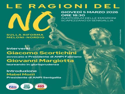 In questo marzo le nostre energie per la campagna referendaria del referendum sulla giustizia del 22 e 23 marzo 2026. Nell’insieme di forze, di rete, di conoscenze e di collaborazione abbiamo organizzato tre appuntamenti. Il primo dei tre, è giovedì 5 marzo 2026 alle ore 18:30 all’Auditorium delle Emozioni a Scapezzano con Giacomo Scortichini, avvocato e Presidente di ANPI Fabriano, e Giovanni Margiotta, laureando in Giurisprudenza, con introduzione della Presidente di ANPI Senigallia Mabel Morri.