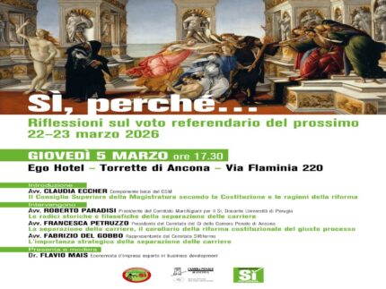 – Giovedì 5 marzo alle ore 17.30 presso l’EGO Hotel di Ancona, sarà l’avv. Claudia Eccher, componente laico del Consiglio Superiore della Magistratura ad introdurre la conferenza “SI perché …riflessioni sul voto referendario del prossimo 22-23 marzo”.