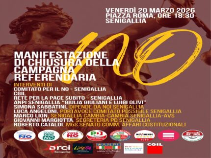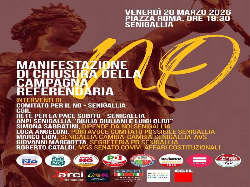 Tutti insieme. Tutte le associazioni, i partiti e i movimenti che si sono spesi con eventi singoli o di rete, si riuniscono per la manifestazione di chiusura della campagna referendaria per il NO al referendum sulla giustizia, venerdì 20 marzo 2026, dalle ore 18:30, in Piazza Roma a Senigallia.