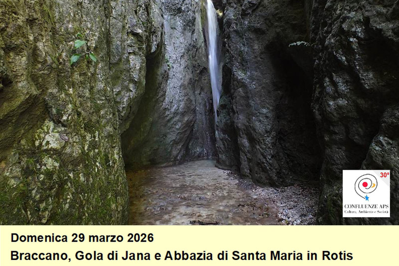 Confluenze: escursione a Braccano Gola di Jana e abbazia di Santa Maria in RotisDistanza 10 km, Difficoltà tecnica, E (Escursionistica), Dislivello 240 m, Tipo di percorso Anello, Tempo di percorrenza 4 ore circa, cani ammessi. Si consiglia abbigliamento adeguato alle condizioni climatiche, calzature da trekking, riserva d’acqua, snack al seguito e binocolo.