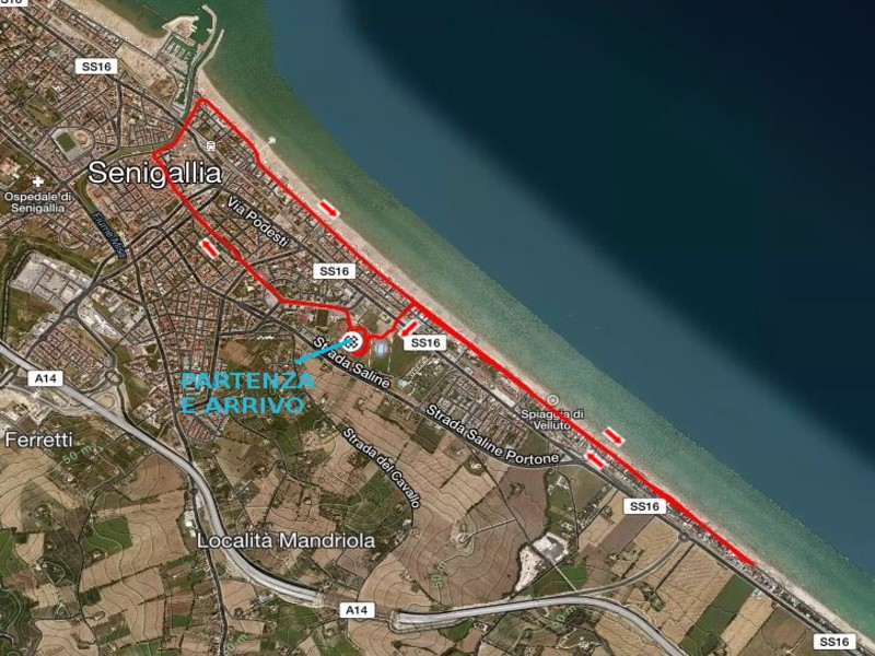 Il percorso prevede partenza e arrivo dalla pista di atletica in zona Saline, l’attraversamento del centro storico (Corso 2 Giugno) transito sul lungomare di levante dalla zona porto, con passaggio di fronte alla Rotonda e giro di boa all’altezza del Hotel Diana e ritorno con arrivo in pista.