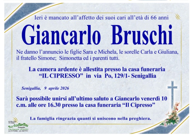 Ieri è mancato all’affetto dei suoi cari Giancarlo Bruschi, di anni 66.