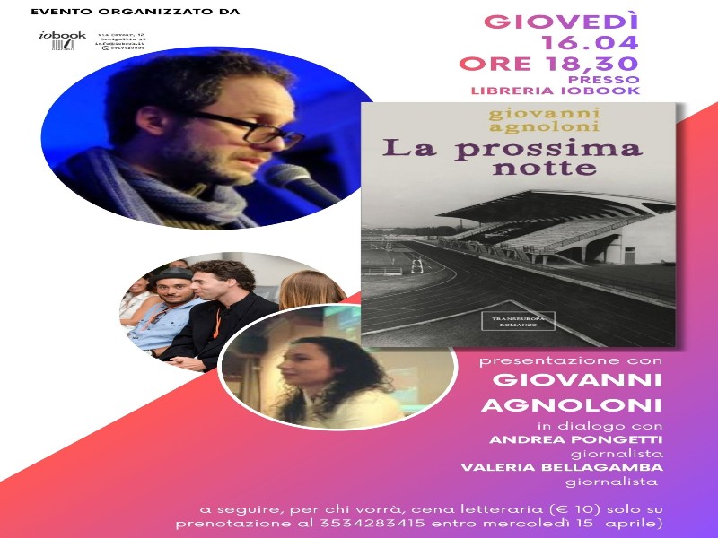 Giovedì 16 aprile alle 18,30 alla libreria iobook torna lo scrittore fiorentino Giovanni Agnoloni per presentare il suo nuovo libro ‘ La prossima notte’edito da Transeuropa.