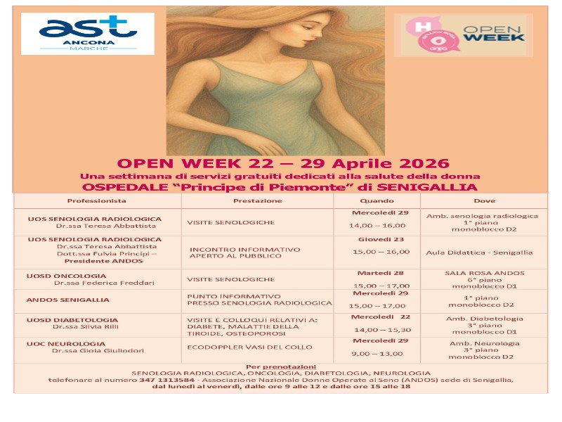 Sono inoltre in programma presso la Unità Operativa di Oncologia con la Dr.ssa Federica Freddari delle visite senologiche, martedì 28 aprile, dalle ore 15 alle ore 17 presso la Sala Rosa Andos, al sesto piano, monoblocco D1.