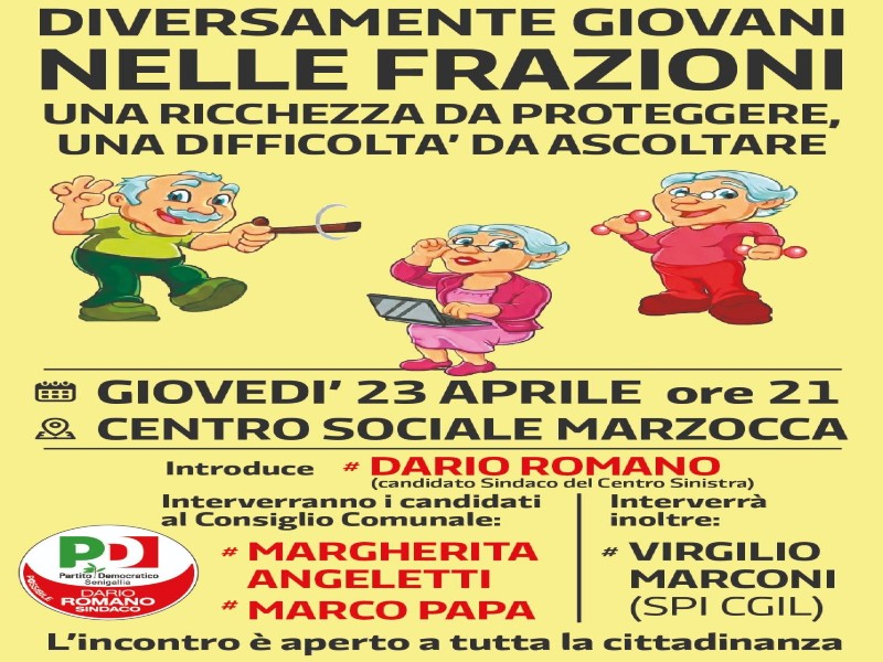 Giovedì 23 aprile alle ore 21:00, presso il Centro Sociale Adriatico di Marzocca, si terrà l’incontro dal titolo “Diversamente giovani nelle frazioni. Una ricchezza da proteggere, una difficoltà da ascoltare”.