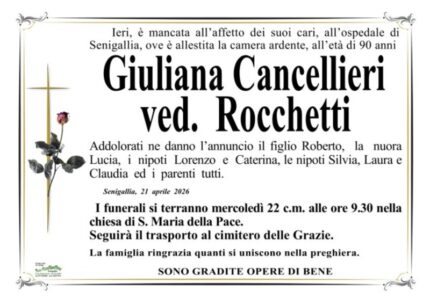 Ieri è mancata all’ospedale di Senigallia, dove è allestita la camera ardente, all’età di 90 anni Giuliana Cancellieri, vedova Rocchetti.