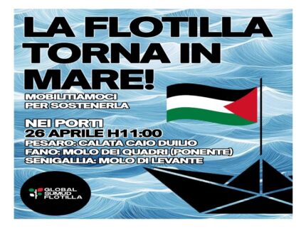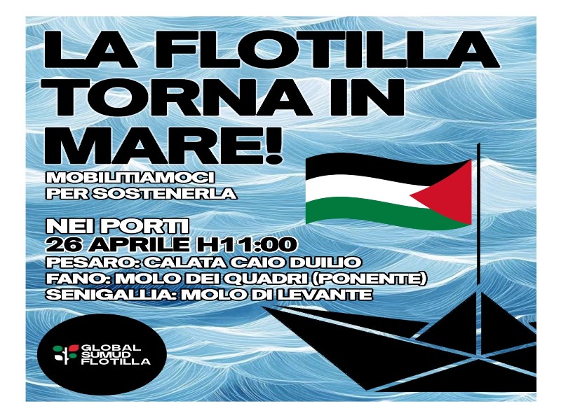 Invitiamo la cittadinanza ad intervenire domenica 26 aprile, alle ore 11.00, presso il Molo di levante del porto di Senigallia e alle ore 12.00 davanti alla Rotonda, per salutare insieme con letture e interventi la seconda Flotilla in partenza dalla Sicilia, mentre alcune barche solcheranno il mare con issata la bandiera palestinese.