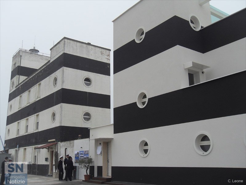 La rinnovata caserma della Guardia Costiera e, sulla sinistra, il vecchio faro di Senigallia