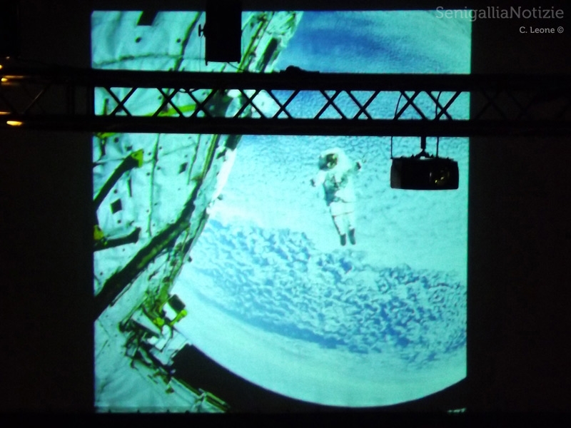 All'esterno del modulo ISS l'astronauta Paolo Nespoli. Sullo sfondo, la Terra. Foto di Carlo Leone per Senigallianotizie.it